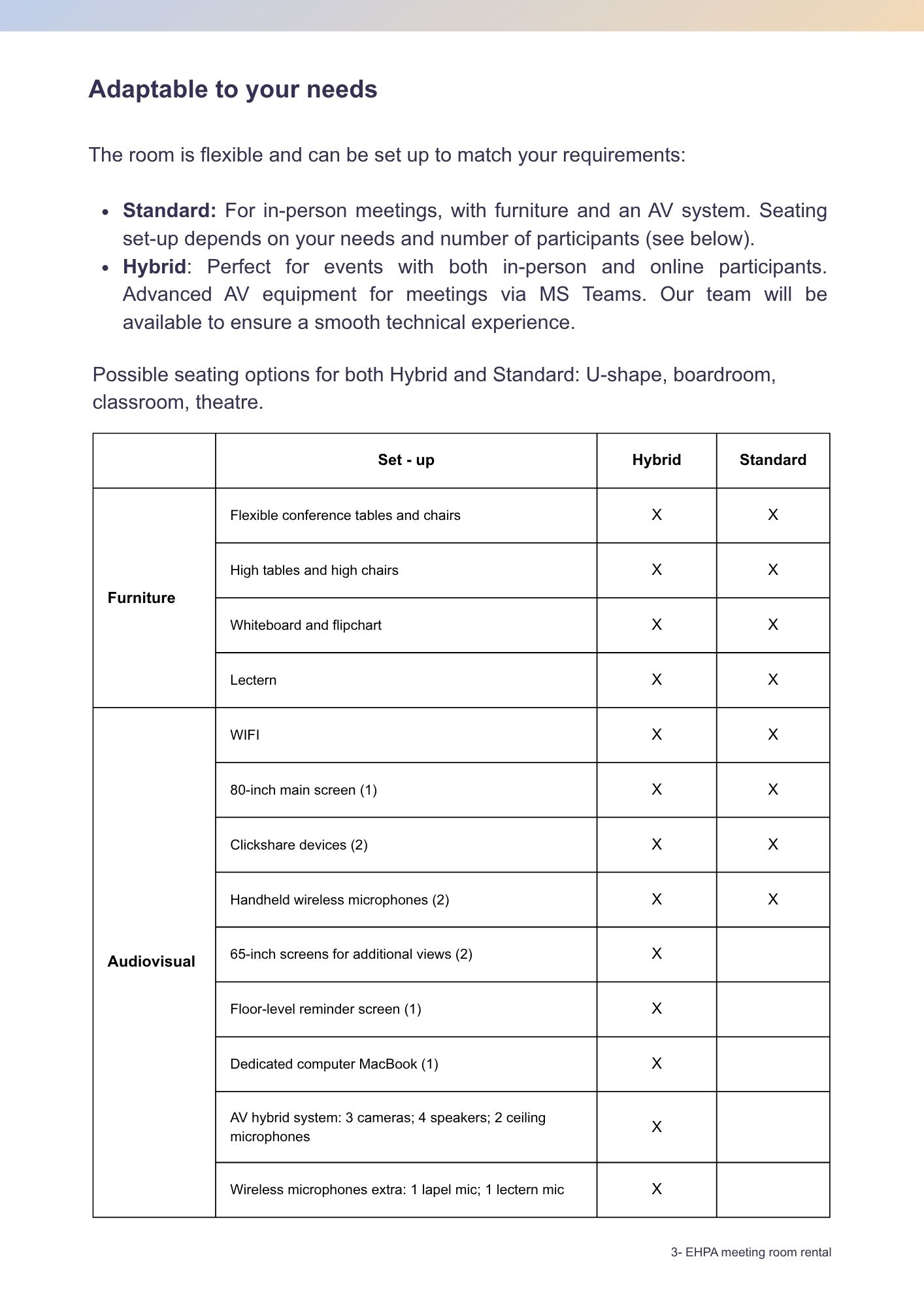 Seating up to 50 people and offering flexible setups and formats – including separation into two rooms – the space can be tailored to meet your needs.