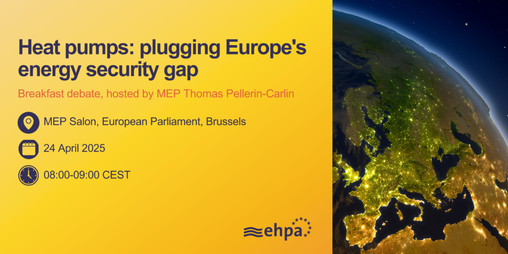 The European Heat Pump Association (EHPA) invites you to a breakfast meeting on 24 April from 08:00 to 09:00, focusing on “Heat pumps: plugging Europe’s energy security gap” in the context of the European Parliament’s Own Initiative Report on EU Energy Supply Security.