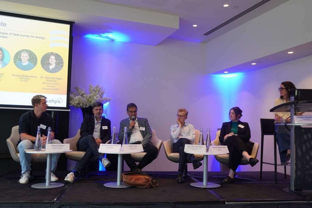 The speakers and panel were Ms. Annalisa Corrado, MEP S&D Italy; Mr. Michael Bloss, MEP Greens Germany; Ms. Nicolás González Casares, MEP S&D Spain ; Mr. Peter Liese, MEP EPP Germany, Mr. Samuel Butler Sloss, Manager – Ember Futures; Ms. Dr. Yara Van Ingen, Buildings Decarbonization Analyst – BloombergNEF. It was moderated by Jozefien Vanbecelaere, Policy Director at EHPA.